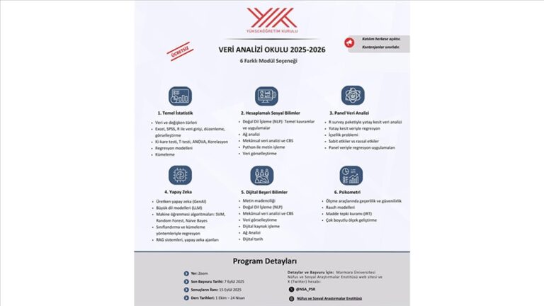 YÖK himayesinde ve Marmara Üniversitesi Nüfus ve Sosyal Araştırmalar Enstitüsü koordinasyonunda hayata geçirilen ücretsiz ve çevrimiçi “Veri Analizi Okulu” başlıyor. Türkiye’nin önde gelen araştırma üniversitelerinin katkı sunduğu projede Boğaziçi Üniversitesi de önemli bir paydaş olarak yer alıyor. Program; yapay zekâdan dijital beşeri bilimlere uzanan geniş bir eğitim yelpazesi sunarak veri bilimi, istatistik ve yapay zekâ […]